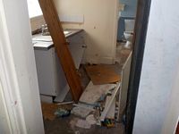 Our Ashbourne RICS surveyors inspected this terrace house. The front and rear walls of this property had been bably damaged by water because of failure to undertake a few hundred pounds of gutter and down pipe repairs. Intruders had damaged the kitchen and bathroom and run off with the boiler as well as damaging central heating pipes. An extension containing the bathroom and kitchen was single skin construction and likely to be cold and porne to water penetration. An attic conversion had dangerous stairs and no fire protection and probably no insulation of the ceiling.